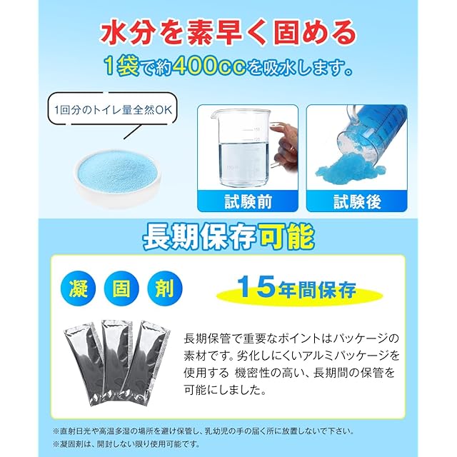 【15年長期保存可能】 簡易トイレ の 凝固剤 には劣化しにくいアルミ製のパッケージを採用することで長期保管を可能にしました。災害時の備えとして、安心して保管しておくことができます。 災害用トイレ は 特に災害時にはトイレの利用が制限されることがありますが、この防災トイレがあれば、衛生的なトイレ環境を確保できます。