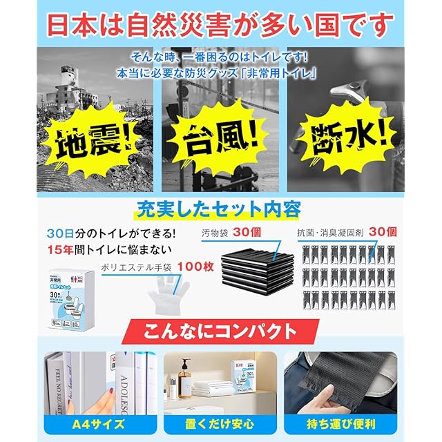 商品名:【即納・防災士監修・抗菌・消臭】 簡易トイレ 非常用トイレ 30~60回分 防災 トイレ 15年保存 凝固剤 防災グッズ 仮設トイレ 災害用 携帯トイレ ポータブルトイレ 災害用トイレ 携帯 旅行 キャンプ 車 登山 備蓄 介護用 防臭 防菌 軽量 防災トイレ 地震 避難 災害 断水 自宅 法人 学校