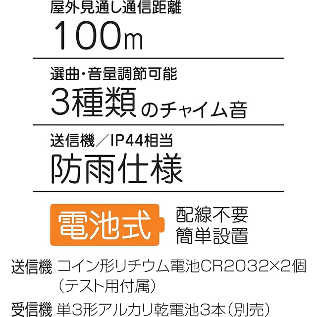 受信チャイム:サイズ(約)/66×96×33mm (70g ※電池含まず)、電源/DC4.5V単3アルカリ電池3本 (別途ご用意ください)、電池寿命/約6カ月 (1日10回受信・気温20度時)、電源スイッチ/あり、音量調節/5段階 最大83dB/1mの範囲で可変着信表示LED/チャイム鳴動中に赤LEDが点滅、受信可能距離/屋外見通し最大100m・屋内見通し最大50mまで、使用エリア/屋内用