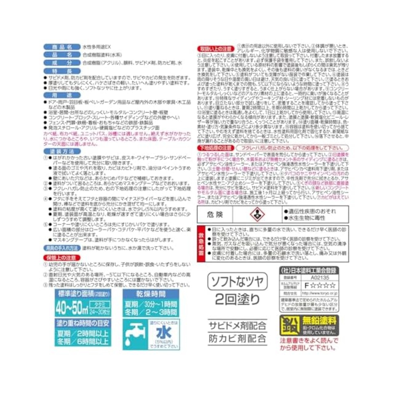 用途:(屋内外区分:屋内外用)ドア、雨戸、羽目板、板べい・ガーデン用品など屋内外の木部や家具・木工品などの木製品。浴室・居間・台所などのしっくい・モルタル・コンクリート壁・板壁。コンクリート・ブロック・スレート・各種サイディングなどの外壁やへい。フェンス・門扉・鉄柵・看板・おもちゃなどの鉄部・鉄製品。発泡スチロール・アクリル・硬質塩ビなどのプラスチック面。