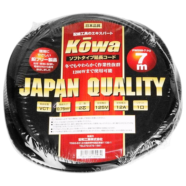 商品名:宏和工業 kowa ソフトタイプ延長コード 12A・7m 1ツ口 クロ FW098-7 日本製