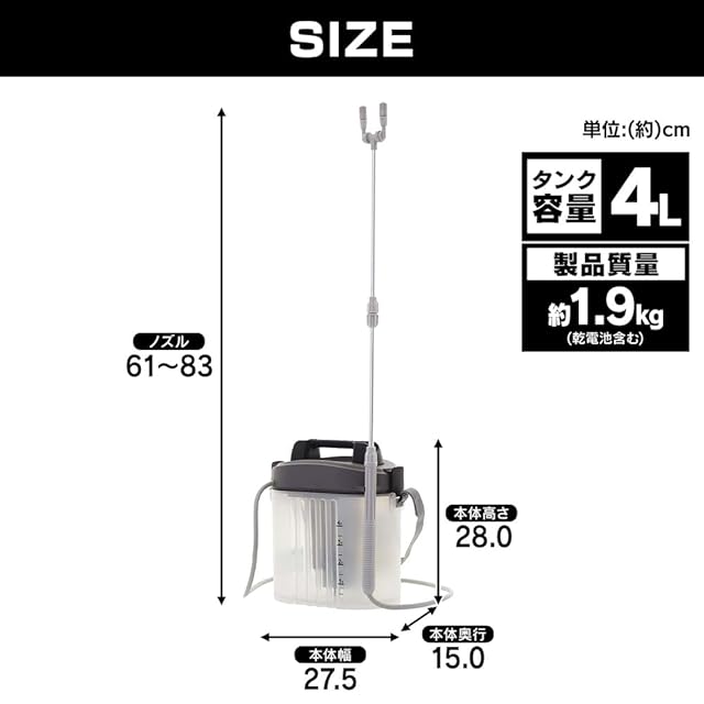 ノズルの長さ:約61~83cm、製品重量:約1.9kg(乾電池を入れた場合)