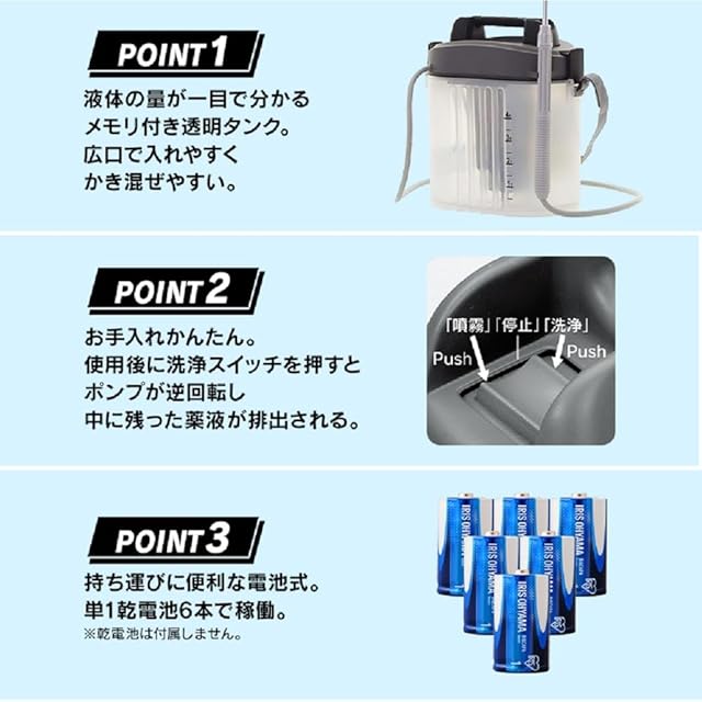 噴霧能力:約400cc/分(アルカリ乾電池初期時)