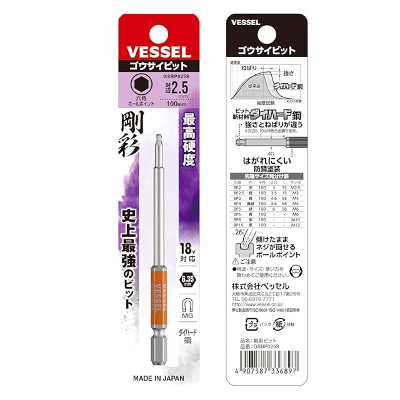 商品名:ベッセル(VESSEL) 片頭ボールポイント 剛彩ビット 対辺2.5×100 1本 GSBP025S