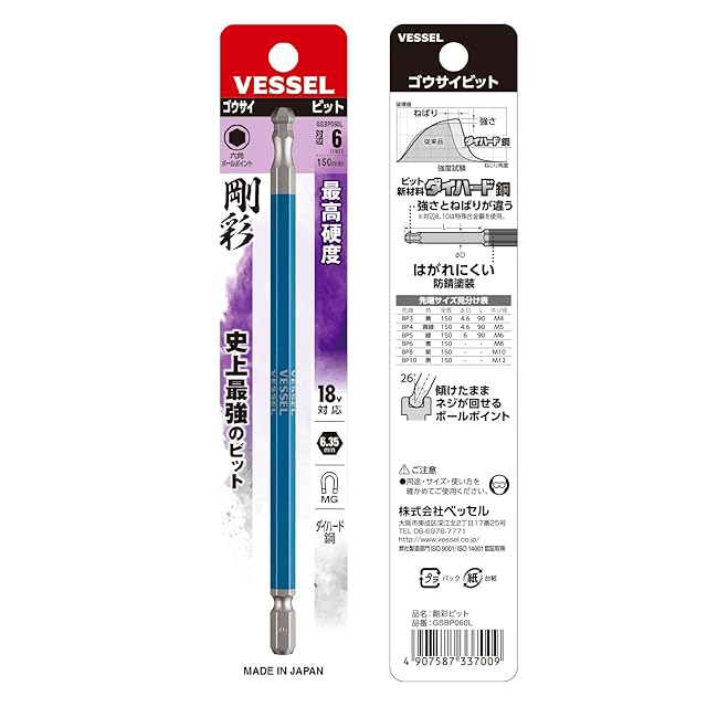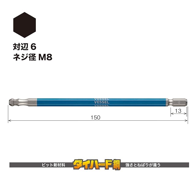 商品名:ベッセル(VESSEL) 片頭ボールポイント 剛彩ビット ロングタイプ 対辺6×150 1本 GSBP060L