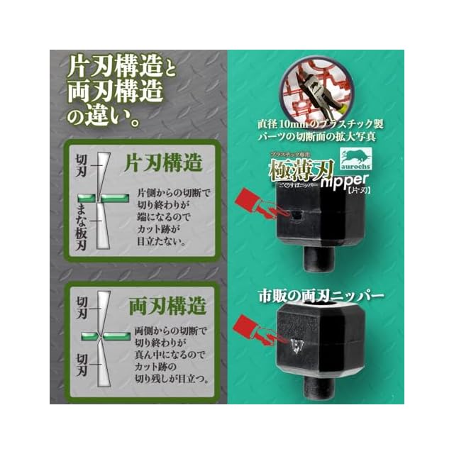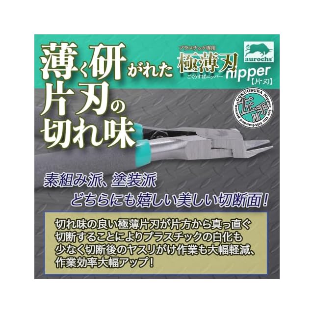 極薄に仕上げられた片刃構造のプラスチック切断専用ニッパー。 薄く繊細に研ぎ出された刃先は通常のニッパーよりも美しくゲートを切断可能です。切れ味の良い極薄片刃が片方から真っ直ぐ切断することにより プラスチックの白化も少なく切断後のヤスリがけ作業も大幅軽減、作業効率大幅アップ。