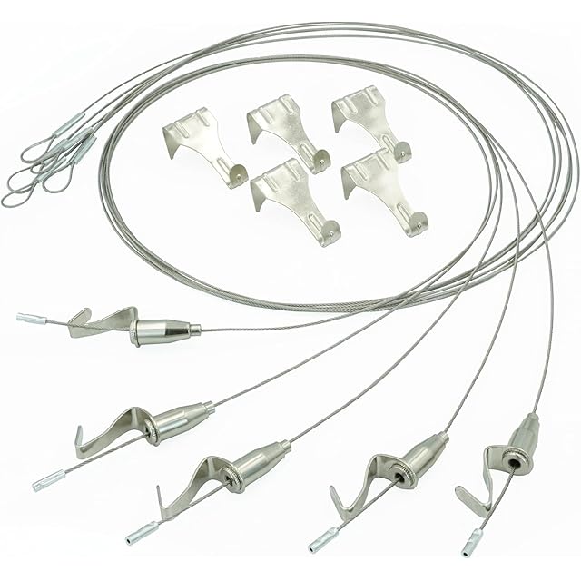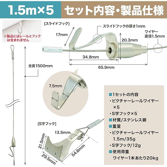 【簡単調節可能】 上下の移動はピンを押すだけで簡単に位置調節が可能です。額、ポスター等を好きな高さに簡単に移動させることが可能です。 【日本専門機関にて検査済み】 日本専門機関にて検査済み商品です。最大40kgまで耐えることができます。 【使用方法】ワイヤーのループ状部分をレールフックにひっかけます。(レールフックは付属しておりません。別途購入してください。)本商品のピクチャーフックを額縁の裏にひっかけます。額縁からワイヤーがはみ出してしまう場合は、はみ出したワイヤーを丸めてテープなどでまとめ、額縁の裏に隠します。S字固定具は、ピクチャーレール以外の場所でワイヤーを使用する場合にご活用ください。 【商品詳細】 ワイヤー5本 フック5本 S字固定器具5個(ワイヤーにフックが1個とりつけられており、予備用のフックは同梱していません) < ワイヤー>0.5m太さ1.5mm(全ての選択肢共通<フック>全長62mm横幅18mm<S字固定器具>全長51mm横幅29mm※画像に詳細が記載しております。 【メーカー3年】ネセクトは売ったら終わりでなく、売ってからがお客様との本当のお付き合いの始まりだと考えています。万が一、商品の品質に問題がある場合は返金や新品交換等の対応をさせていただきますので、ご安心ください。