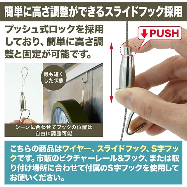 【使用方法】ワイヤーのループ状部分をレールフックにひっかけます。(レールフックは付属しておりません。別途購入してください。)本商品のピクチャーフックを額縁の裏にひっかけます。額縁からワイヤーがはみ出してしまう場合は、はみ出したワイヤーを丸めてテープなどでまとめ、額縁の裏に隠します。S字固定具は、ピクチャーレール以外の場所でワイヤーを使用する場合にご活用ください。