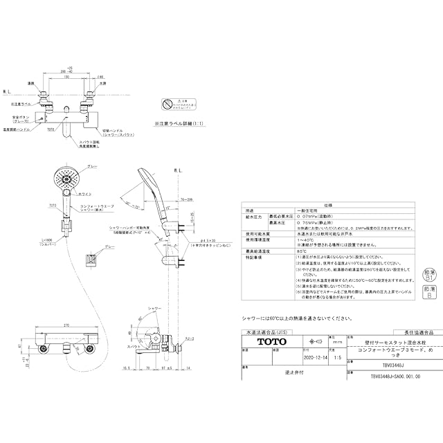 商品名:TOTO 浴室用壁付サーモスタット混合水栓70mmコンフォートウェーブめっき3モード TBV03448J