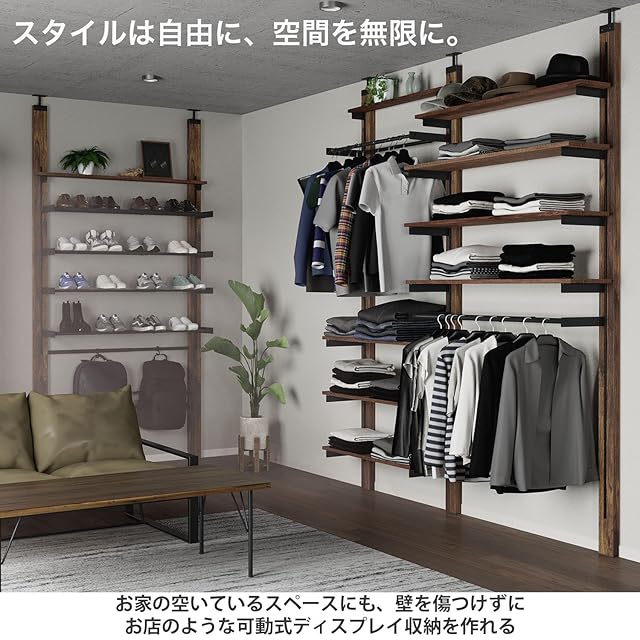 Shelf Rail シリーズの特徴:『スタイルは自由に、空間を無限に』お家の空いているスペースにも、壁を傷つけずにお店のような可動式ディスプレイ収納が作れます。