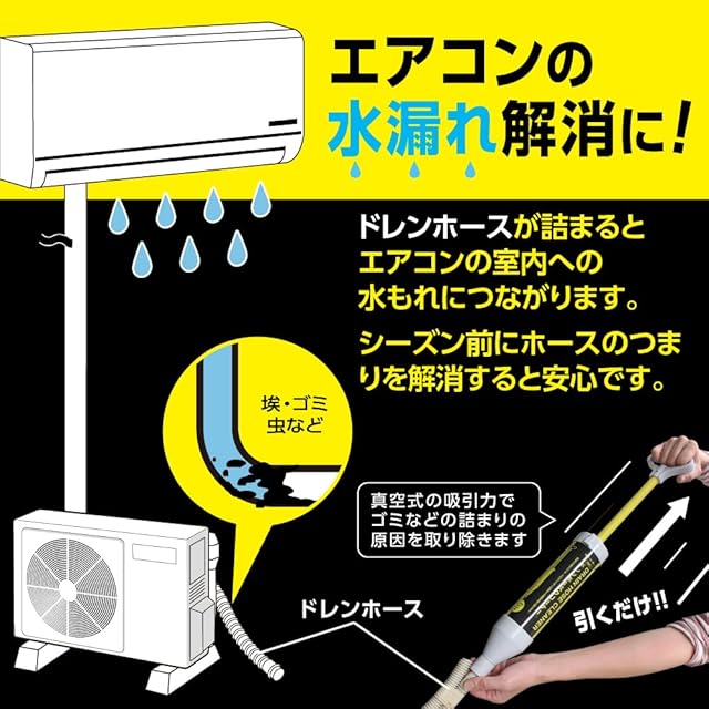 【手入れの難しいホースもこれ一つで楽々! 】真空式で吸引力のあるドレンホースクリーナーを使うことで、ホース内のゴミなどのつまりを吸引し、取り除きます。細くて手入れのしずらい室外機のホースもこれ一つで簡単お掃除。エアコンの水漏れを防ぎます。