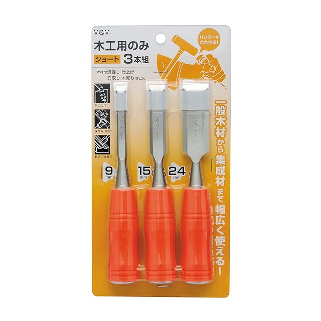 商品名:高儀(Takagi) M&M 木工用 のみ ショート 3本組【木工工作、蝶番取り付け、敷居の溝修正などに】【ハンマーで叩ける】【面取り、木彫りなどに】TAKAGI 木工作業 ノミ 工具 DIY 鑿 カンナ 木工 ノミセット