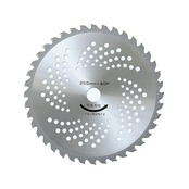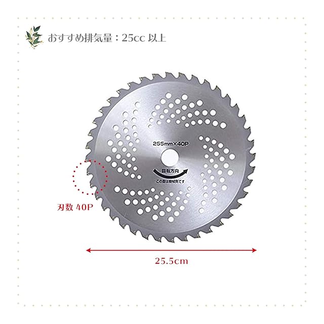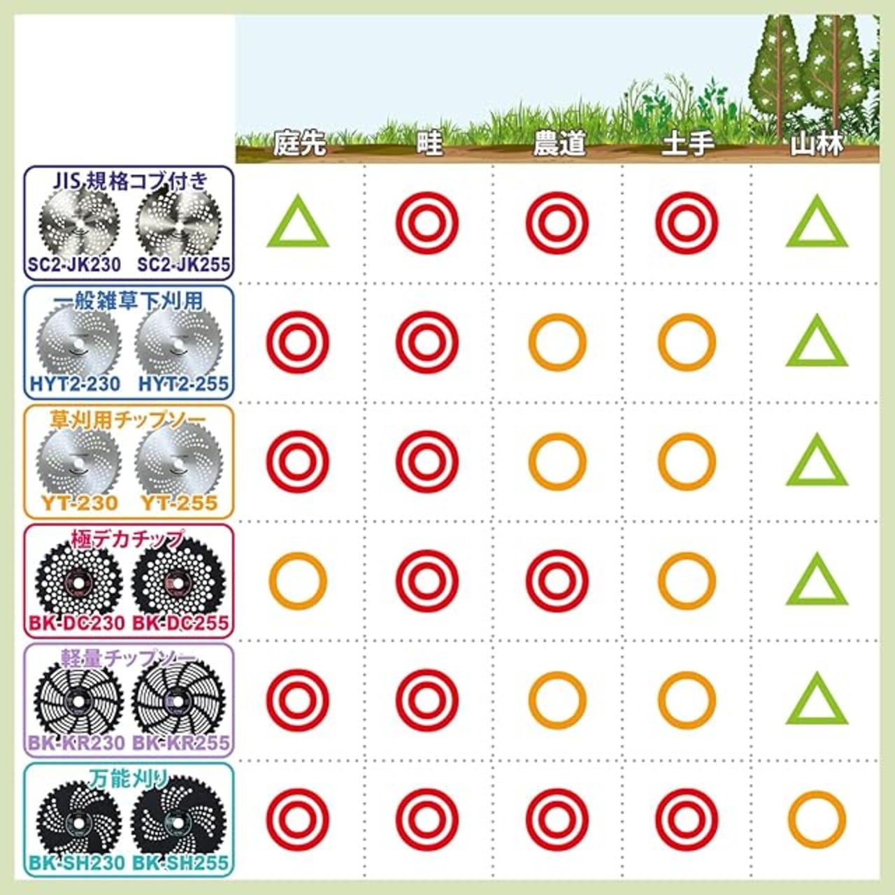 【特徴】一般雑草下刈用チップソーです。軽量メッシュタイプで重さを軽減し、斜強力埋込型で衝撃性に優れておりチップの飛びが少なく、4面研磨で切れ味の鋭さが抜群です。芝や雑草、笹、小枝等の下刈に最適です。エンジン排気量25㏄以下の刈払機でご使用できます。