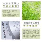 【特徴】一般雑草下刈用チップソーです。軽量メッシュタイプで重さを軽減し、斜強力埋込型で衝撃性に優れておりチップの飛びが少なく、4面研磨で切れ味の鋭さが抜群です。芝や雑草、笹、小枝等の下刈に最適です。エンジン排気量25㏄以下の刈払機でご使用できます。