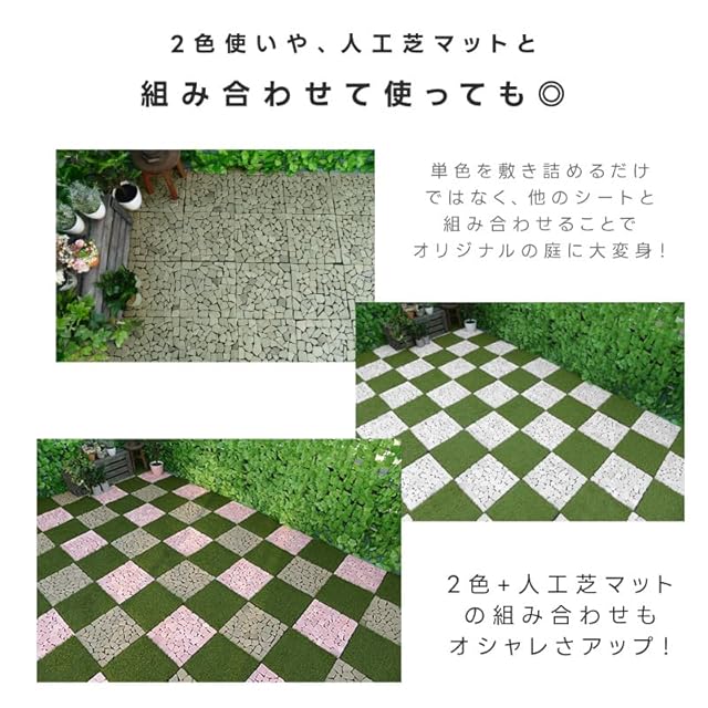 【雑草防止用シート付】日光を遮りつつが通る仕様なため、お庭の雑草が育ちにくい構造に。敷くだけで防草効果もございます。また、プラスチック製のジョイント式ではございませんので、若干の凹凸があっても地面に沿って敷く事が出来ます。