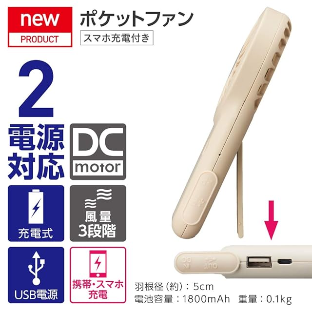 電源:DC5V USB電源(5V 0.5A)/内臓充電池、内臓電池:リチウムイオン電池 3.7V 1800mAh(内臓電池容量)、充電時間:約5時間(電池が空状態から充電を開始/室温25℃)、使用時間:強(約2.5時間)、弱(約6時間)(満充電状態から使用/室温25℃)、消費電力:約2.8W、USB端子出力:DC5V 1A、USBケーブル長さ:約1m