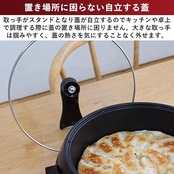 【ふたの置き場所に困らない】ふたは取っ手がスタンドとなり自立するのでキッチンで調理する際や卓上で使用する際にも置き場所に困りません。取っ手もしっかりつかめる大きさなので、ふたの熱さを気にすることなく外せます。