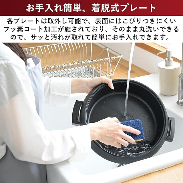 【商品仕様】◇本体サイズ:深なべ使用時=幅34.3×奥行33.3×高さ22.2cm/波型プレート使用時:幅33.3×奥行33.3×高さ18.7cm ◇本体重量:深なべ使用時=2.5kg/波型プレート使用時=約2.3kg(ふた、電源コード含む) ◇プレート寸法:深なべ=直径26×深さ6cm/波型プレート=直径26×深さ3cm ◇深なべ容量:2.0L ◇電源コードの長さ:1.8m ◇電源:AC100V(50/60Hz) ◇消費電力:1300W ◇期間:お買い上げ日より1年間(の範囲については、取扱説明書をご確認ください。(一般家庭用以外(業務用など)に使用された場合の故障及び損傷などは対象外となります))