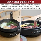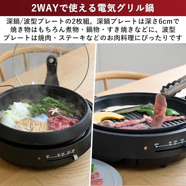 【2WAYで使える電気グリル鍋】「焼く」「煮る」「蒸す」がこれ1台で楽しめる深鍋/波型プレートの2枚組グリル鍋。直火にも対応している深鍋は焼き物はもちろん煮物・鍋物・すき焼きなどに、波型プレートは焼肉・ステーキなどのお肉料理に、様々な料理が家族や友人と食卓を囲んで楽しめます。火力はハイパワー1300Wでおいしく仕上げます。