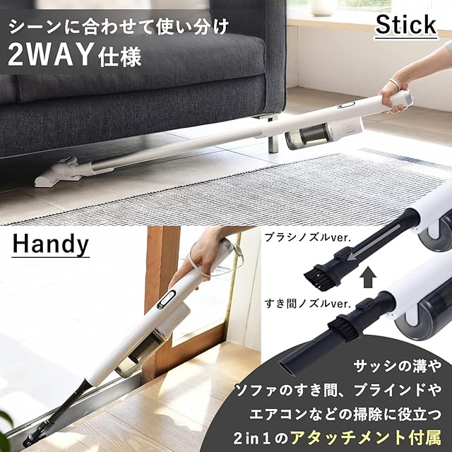 【2WAY仕様】シーンに合わせてスティック&ハンディの2WAYで使用できます。付属のブラシ付きすき間ノズルを装着することで、サッシの溝やソファの隙間、またブラインドやエアコンなど、あらゆる場所の掃除に役立ちます。