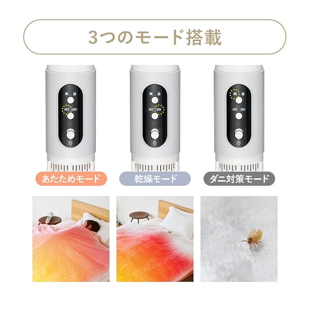 3つのモード。乾燥モード:湿度を飛ばし乾燥させます。あたためモード:ふとんを10分で温めてくれます。。ダニ対策モード。