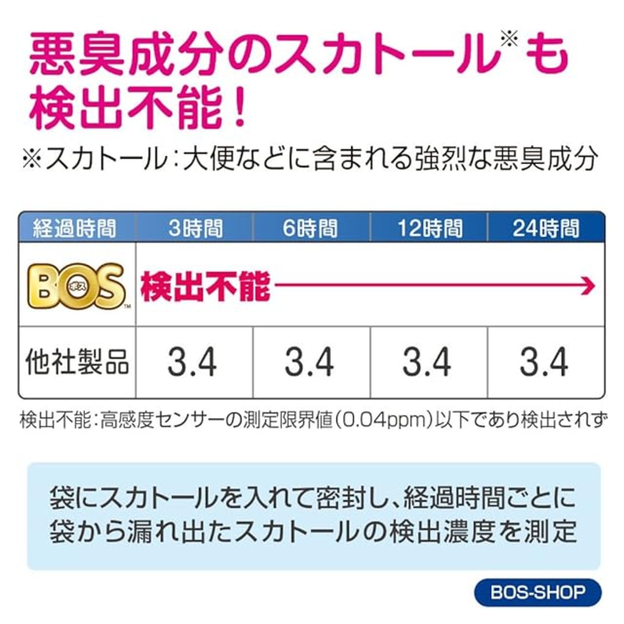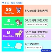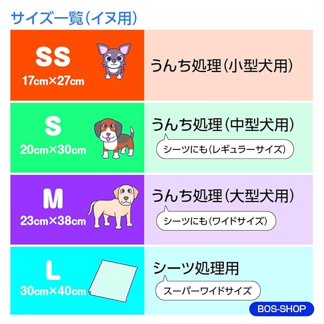 私たち「BOS-SHOP」は高機能な袋を製造しているメーカーです。 <br>BOS(ボス)はうんちの臭いを防ぐために開発されました。 <br>長い開発期間を経て生まれたBOS。防臭力は圧倒的!自信を持っておすすめ致します。 <br>BOSをご購入いただいた方のアンケート結果やカスタマーレビューでは、多くの驚きの声と共に、とても高いご評価を頂きました。 <br> <br><アンケート結果> <br>「今後もBOSを購入したい」…95% <br>「BOSの防臭性能に満足」…99% <br>「BOSで臭い問題が解決」…99% <br>※ご回答者数:150名(ご協力いただいた皆さまありがとうございました!) <br> <br><袋サイズ別ご使用目安> <br>SSサイズ(17×27cm)…うんち処理(小型犬) <br>Sサイズ(20×30cm)…うんち処理(中型犬)、ペットシーツ(レギュラーサイズ) <br>Mサイズ(23×38cm) …うんち処理(大型犬)、ペットシーツ(ワイドサイズ) <br>Lサイズ(30×40cm・マチ付)…ペットシーツ(スーパーワイドサイズ) <br>※他にもLLサイズ(35×50cm・マチ付)、ロングサイズ(17×75cm)もございますので、用途に合わせてお選びください。 <br> <br>※BOSの防臭性能は大変優れていますが、完全に防ぐものではありません。バケツなどに密閉しますと、わずかに漏れる臭いがバケツ内に溜まり、臭いを感じることがあります。