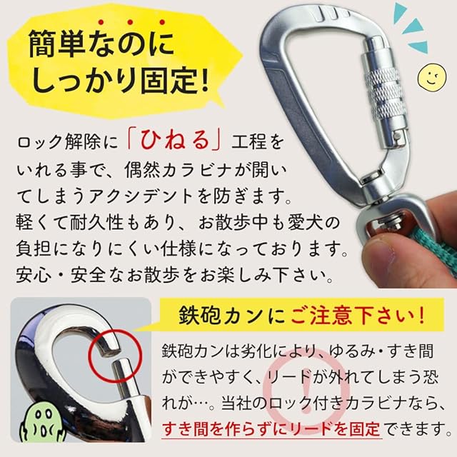 「ロック開閉&360度回転するカラビナ」しっかりと固定できて安心感UP!わんちゃんの急な動きでも外れにくい、隙間ができないロック付きカラビナを採用。360度回転するのでリードも絡まりにくい。 ロックの解除に回転を入れることで偶然カラビナが開いてしまうアクシデントを防ぎます。軽くて耐久性もあり、お散歩中も愛犬の負担になりにく仕様になっております。安心・安全なお散歩をお楽しみください。