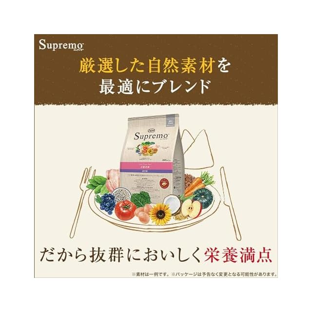 シュプレモ 小型犬用 成犬用は、健康で元気な体、美しい皮膚・被毛、消化吸収の健康維持に配慮し、栄養素を豊富に含む高品質な自然素材を厳選し、最適な栄養バランスでブレンドしています。 また、顎・口が小さい、代謝エネルギーが高いなどの小型犬の特徴に配慮しています。 【小型犬に適した小粒タイプ】