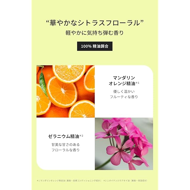 <b>石けん+アミノ酸系洗浄成分の独自の配合バランスで、さっぱり心地よい泡切れとしっとり潤い感を実現</b><br><br>【水分保持力&乾燥ゆらぎ肌をサポート】保湿成分の「ユズ果実エキス」を配合し、なめらか泡で乾燥ゆらぎ肌に潤いを与える<br><br>【軽やかに弾む100%精油のアロマ】華やかなシトラスフローラル調の香り (マンダリンオレンジ精油*2 & セ?ラニウム精油*3)<br><br>【成分のこだわり】95%天然由来・石けん+アミノ酸系洗浄成分・オーガニック・7つのフリー処方*6<br><br>【環境へのこだわり】動物実験なし・バイオマス容器・日本製<br>*1 19年3月20日~21年6月28日ブランド全体での累計獲得数 *2 ニュウコウジュ油(着香・皮膚コンディショニング成分) *3 イランイラン花油(着香・皮膚コンディショニング成分) *4 マンダリンオレンジ果皮油(着香・皮膚コンディショニング成分) *5 ニオイテンジクアオイ油(着香・皮膚コンディショニング成分) *6 合成香料、合成着色料、鉱物油、パラベン、パラフィン、動物由来原料(微生物由来原料及びハチミツ、ミツロウを除く)、PG不使用