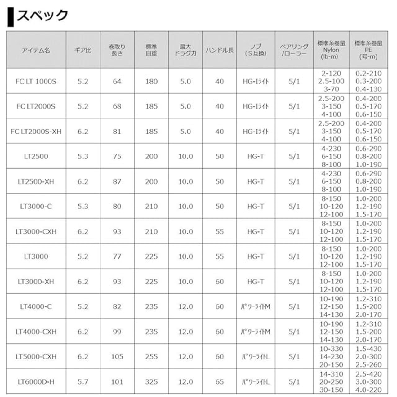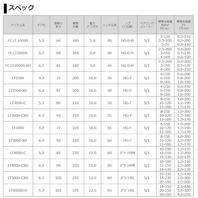 標準巻糸量:ナイロン(lb-m) 10-330、14-230、20-150 / PE(号-m) 1.5-430、2.0-300、2.5-260