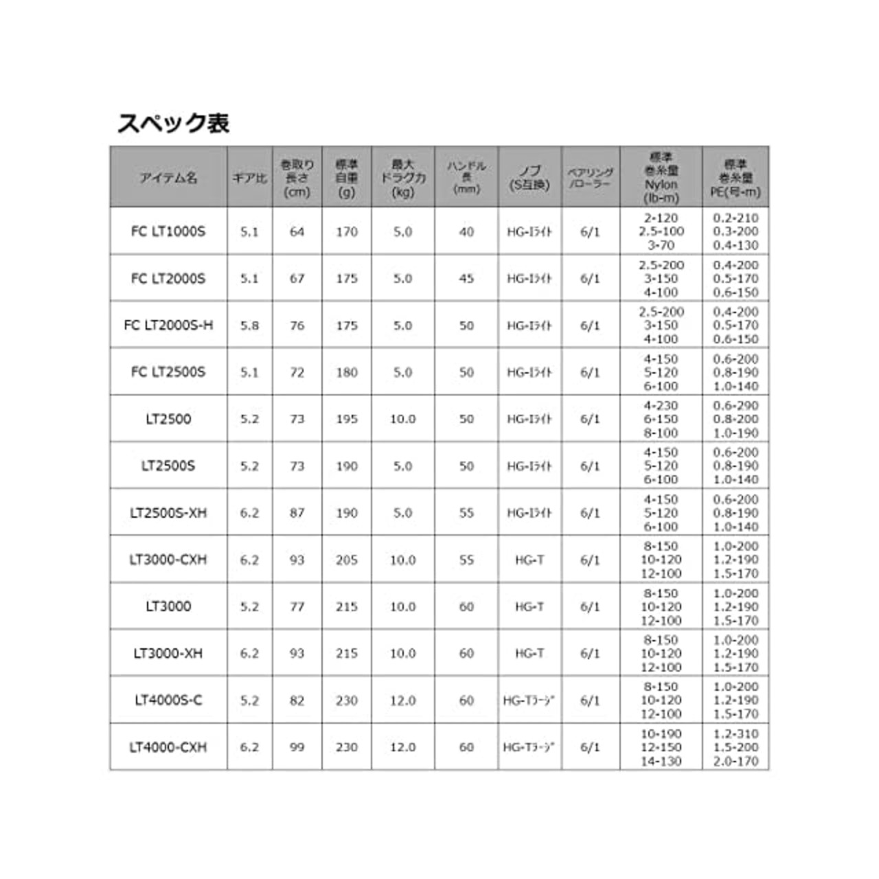 標準巻糸量:ナイロン(lb-m) 8-150、10-120、12-100 / PE(号-m) 1.0-200、1.2-190、1.5-170