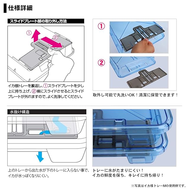 樹脂素材採用でトレーが一度冷えたら温まりにくく、イカを鮮度を保ち、キレイに持ち帰り!
