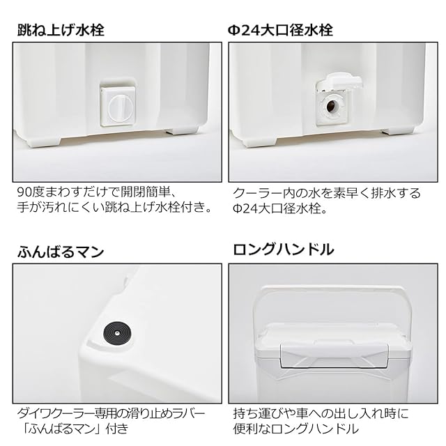クーラー内の水を素早く排水するΦ24大口径水栓 ダイワクーラー専用の滑り止めラバー「ふんばるマン」付き 対象魚に合わせて選べる28リットル、22リットル、16リットルの3サイズ 用途に合わせて選べる断熱仕様(6面真空、1面真空、ウレタン、スチロール)