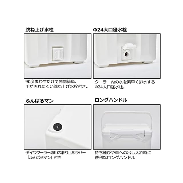 クーラー内の水を素早く排水するΦ24大口径水栓 ダイワクーラー専用の滑り止めラバー「ふんばるマン」付き 対象魚に合わせて選べる28リットル、22リットル、16リットルの3サイズ 用途に合わせて選べる断熱仕様(6面真空、1面真空、ウレタン、スチロール)