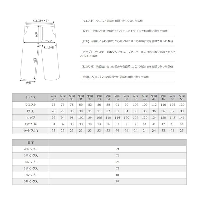 サイズ:W38L30(ウエスト:97cm、股上:36cm、股下:76cm、裾幅:24cm、ワタリ幅:38cm)