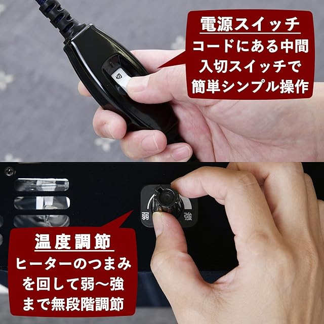 【温度調節】ヒーター温度は、温度調節つまみを回せば弱~強まで無段階での温度調節が可能です。その日の気温や体調に合わせて設定してください。