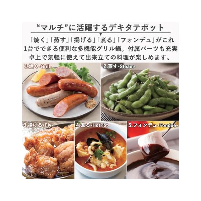 【1台5役】「焼く」「蒸す」「揚げる」「煮る」「フォンデュ」がこれ1台でできる便利な多機能グリル鍋デキタテポット。付属パーツも充実、卓上で気軽に使えて出来立ての料理が楽しめます。