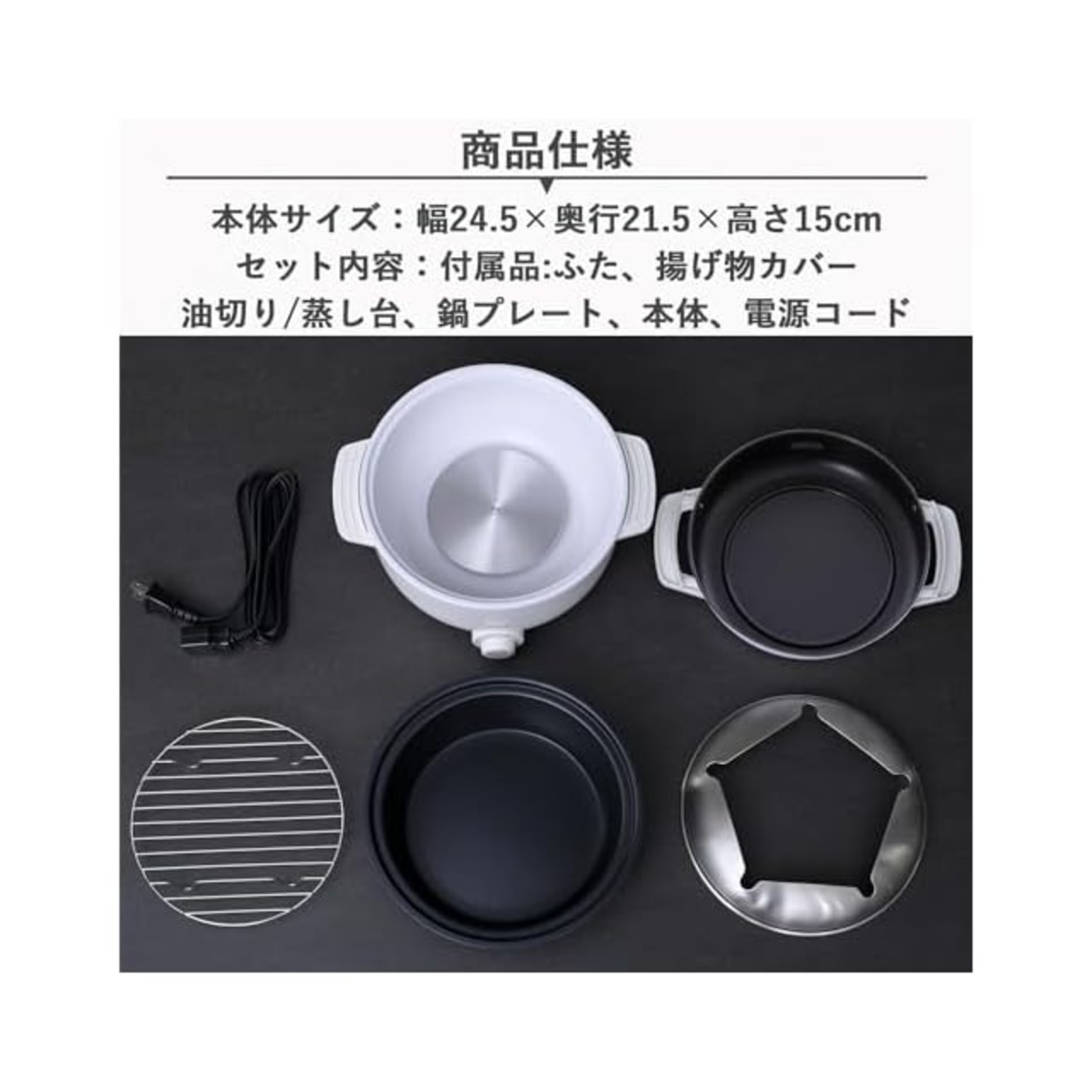 【商品仕様】◇本体サイズ:鍋プレートセット時=幅24.5×奥行21.5×高さ12cm/鍋プレート+ふたセット時:幅24.5×奥行21.5×高さ15cm/鍋プレート+揚げ物カバーセット時=幅24.5×奥行21.5×高さ14.5cm ◇本体重量:鍋プレートセット時=1.1kg/鍋プレート+ふたセット時=1.3kg/鍋プレート+揚げ物カバーセット時=1.2kg ◇定格容量(油量):410g ◇電源コードの長さ:1.5m ◇電源:AC100V(50/60Hz) ◇消費電力:650W ◇期間:お買い上げ日より1年間(の範囲については、取扱説明書をご確認ください。(一般家庭用以外(業務用など)に使用された場合の故障及び損傷などは対象外となります))