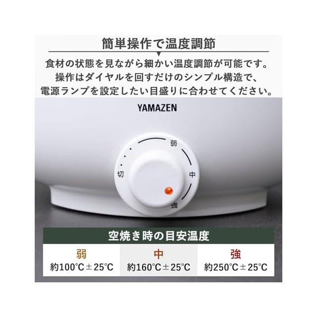 【温度調節】簡単操作のダイヤル式で温度調節が可能です。弱・中・強の目安目盛りがあり、空焼き時の目安温度は「弱」が約100℃±25℃、「中」が約160℃±25℃、「強」が約250℃±25℃となっており、食材の状態を見ながら細かく調節できます。