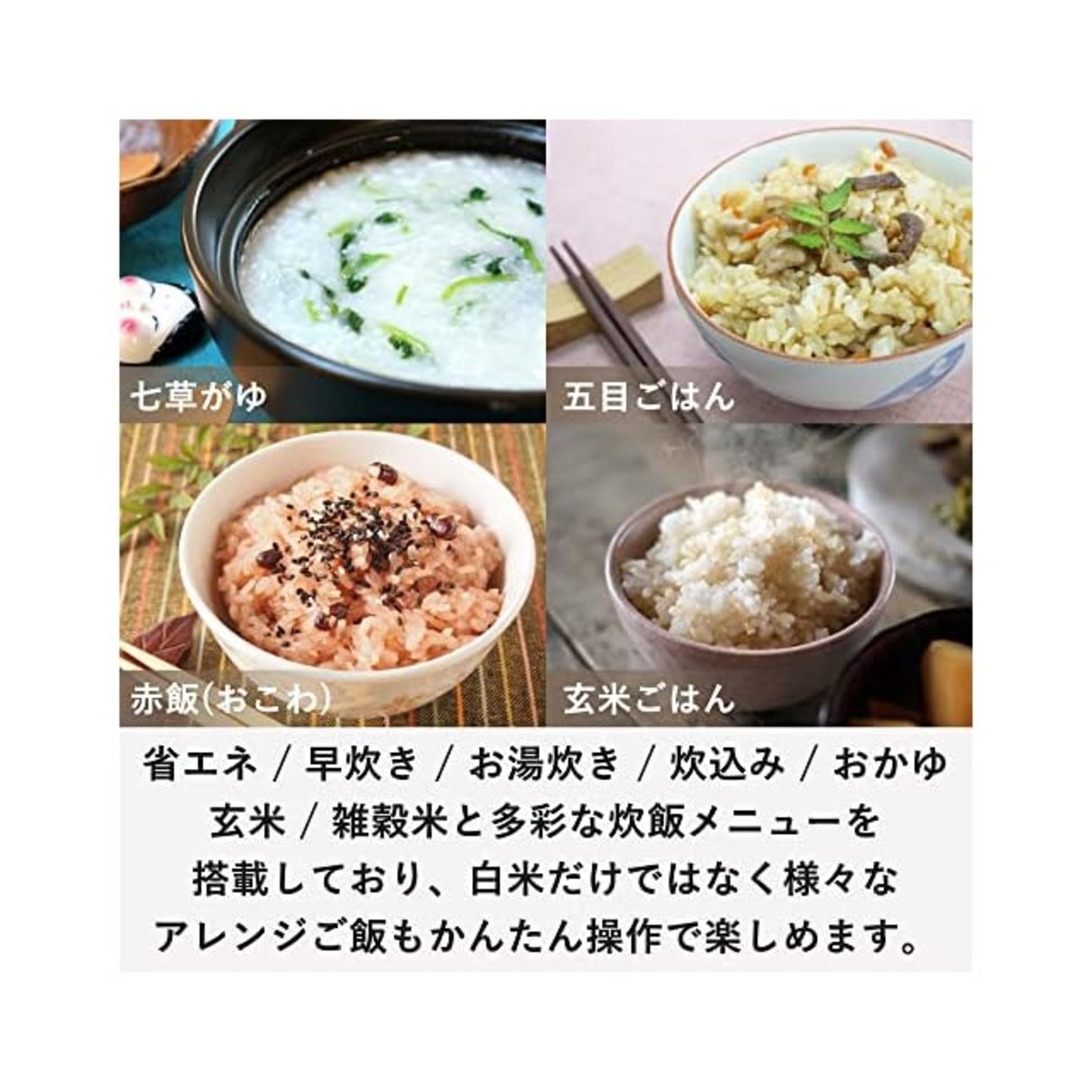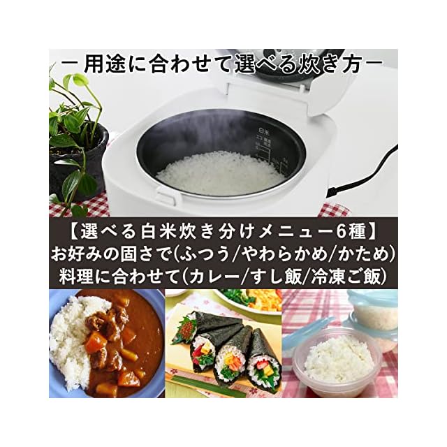 【炊き分けメニューを楽しむ】白米炊き分けは3種類のかたさ(ふつう/やわらかめ/かため)が選べるのと他に、カレー/すし飯/冷凍ご飯の3種のメニューに合わせた炊き分けが可能。メニューに合わせた炊き分けで、いつものご飯がさらにおいしく楽しめます。また、白米に加え、省エネ/早炊き/お湯炊き/炊込み/おかゆ/玄米/雑穀米の炊き分けメニューも搭載しており、お湯炊きでは最短20分で炊飯が可能です。