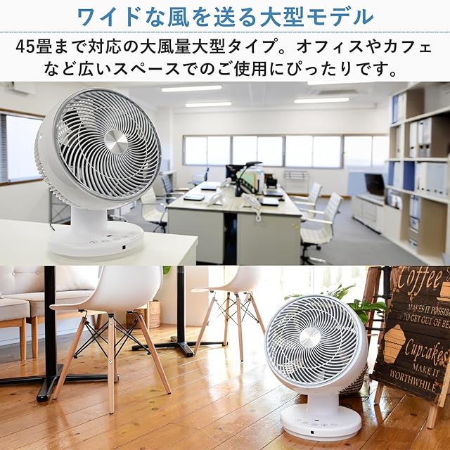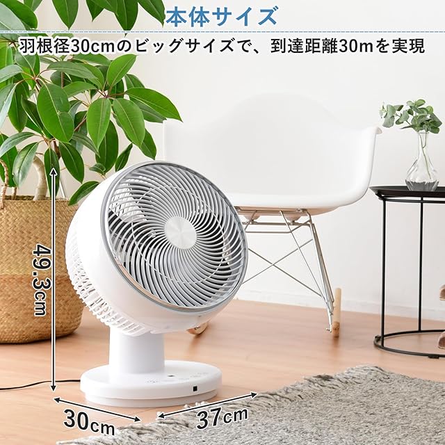 【パワフル送風】30cmの大きな羽根で風を送る大風量サーキュレーター。直進性が強いパワフル送風で45畳まで対応。より遠くまで風を届け、広いお部屋でも空気循環や換気をしっかりサポートします。