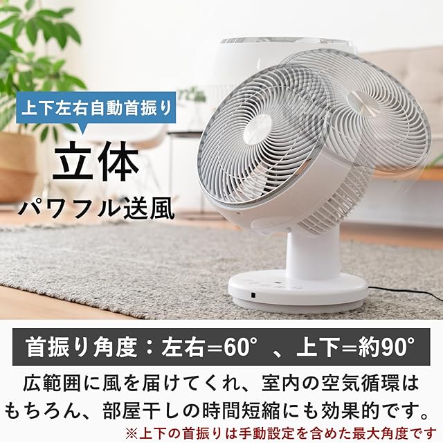 【首振り】上下左右に自動で首振りする立体首振り機能搭載。左右合計60度、上下45度(上下手動=最大90度まで3段階で設定ができ、調整した角度から45度の範囲で自動首振りが可能)までの首振りでお部屋全体に風を届けます。