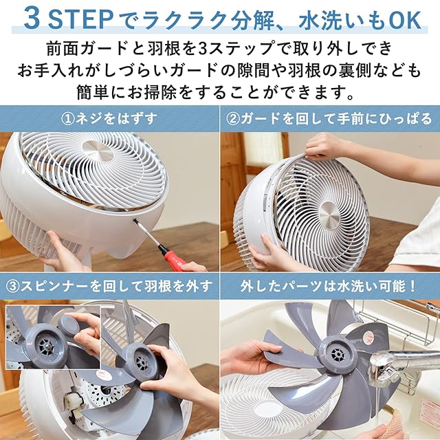 【簡単お手入れ】前面ガードと羽根を3ステップで取り外しでき、お手入れがしづらいガードの隙間や羽根の裏側なども、簡単にお掃除をすることができます。取り外したパーツは水洗い可能なので、いつでも清潔な状態でお使いいただけます。