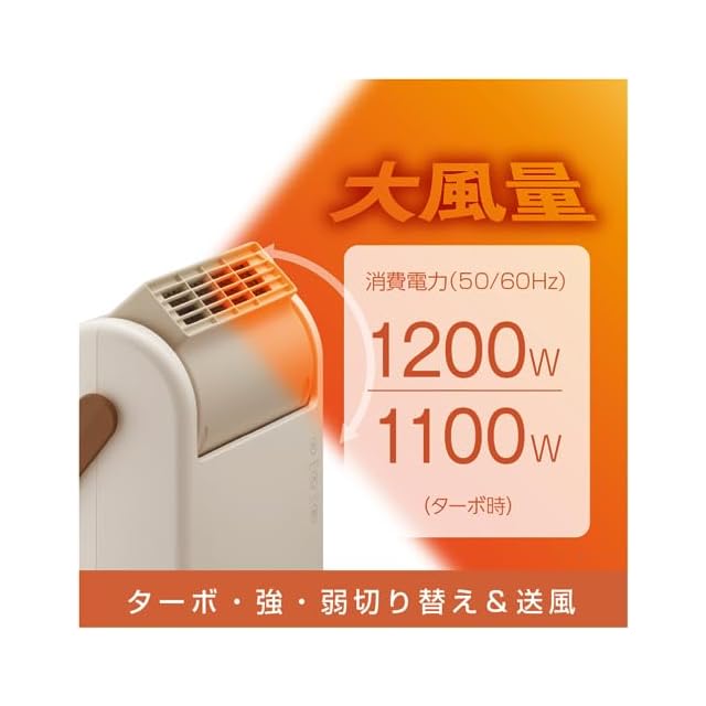 ターボ・強・弱3段階切替+送風、切タイマー、フィルター付吸気口カバー。安全設計(転倒OFFスイッチ、サーモスタット、温度ヒューズ。)チャイルドロック。上下風向き調節