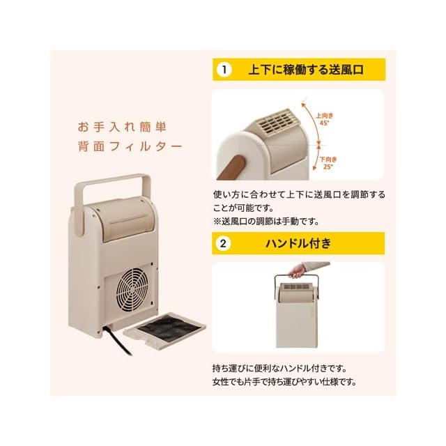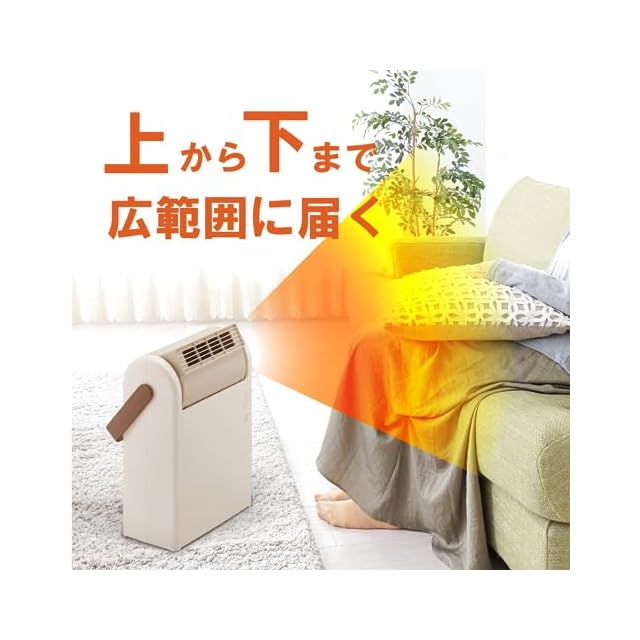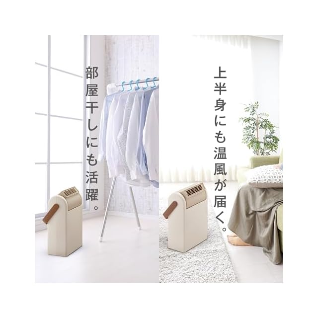 1.広範囲をあたためる。手動で送風口を上下に角度調節可能。2.上半身にも風が届く。送風口が上部にあるため、温風を上半身に浴びたいときに便利。3.部屋干しにも使える。上下首振り+上部送風口で、部屋干しの洗濯物に温風で乾燥できる。
