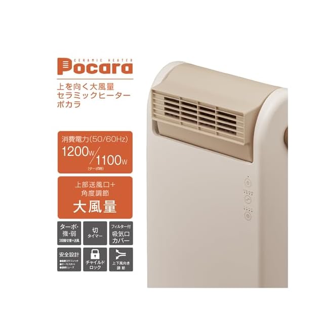 商品名:【上を向く大風量セラミックヒーター】 ドウシシャ セラミックヒーター 手動角度調節 部屋干し 切タイマー チャイルドロック Pocara アイボリー