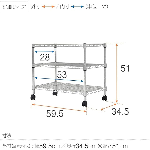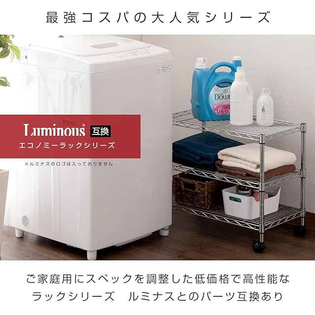 商品名:ドウシシャ メタルルミナスラック キャスター付き スチールラック幅60 3段 EL19-51603 軽量で組立簡単工具いらず 幅59.5×奥行き34.5×高さ51.0cm 棚板耐荷重80kg 全体耐荷重240kg 頑丈 防錆加工 ポール径19mmパーツ対応 キッチンラック 隙間収納