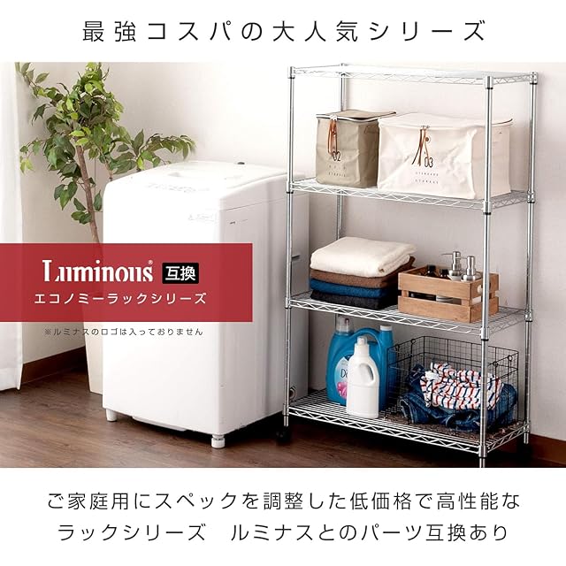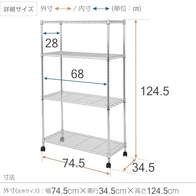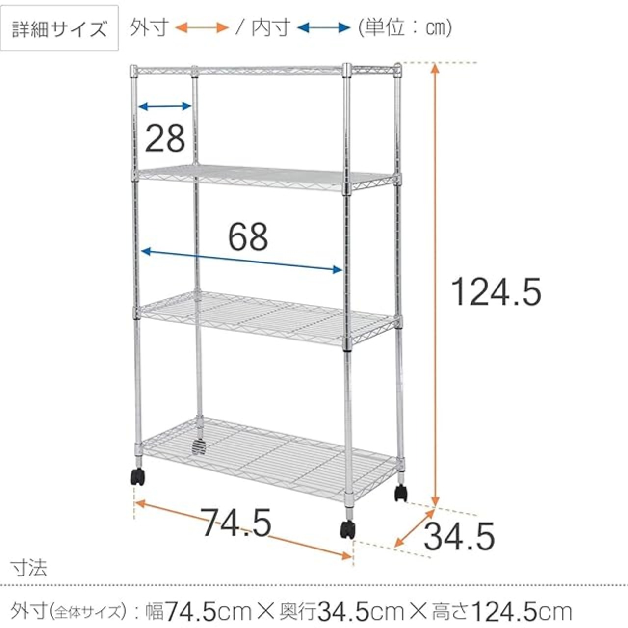商品名:ドウシシャ メタルルミナスラック キャスター付き スチールラック幅75 4段 EL19-12754 軽量で組立簡単工具いらず 幅74.5×奥行き34.5×高さ124.5cm 棚板耐荷重80kg 全体耐荷重320kg 頑丈 防錆加工 ポール径19mmパーツ対応 キッチンラック 隙間収納