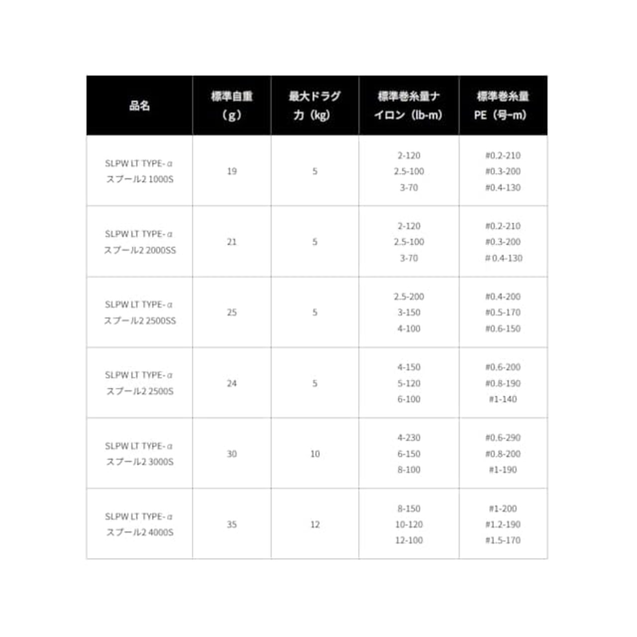 標準巻糸量 ナイロンライン: 8.0lb-150m, 10lb-120m, 12lb-100m
