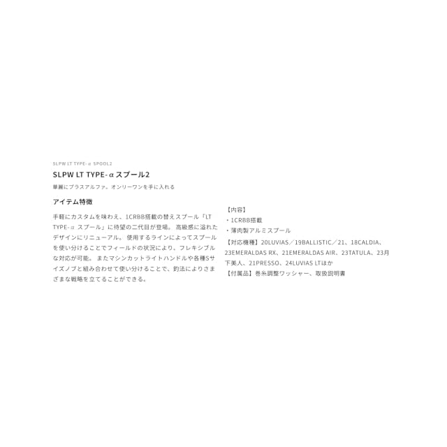 付属品:巻糸状態調整ワッシャー、取扱説明書 / 薄肉製アルミスプール形状 / 1CRBB搭載
